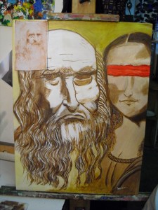 Read more…It’s a Tuesday afternoon in the notorious Skid Row area of Los Angeles, and Jerome Robertson, a hulking figure with a bald head and graying moustache, is deciding where to add his signature to the painting he just completed. It’s a portrait of Leonardo da Vinci propped next to Mona Lisa’s bust, painted in a palette of browns and whites, with the exception of a bright red blindfold covering Mona Lisa’s typically penetrating eyes.